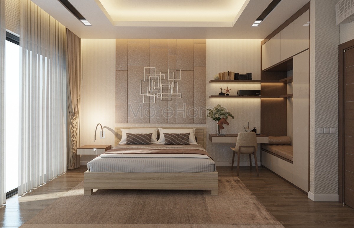 Thiết kế phòng ngủ biệt thự được thiết kế khá tối giản với mẫu giường ngủ gỗ, đầu giường ốp nỉ cao cấp và được trang trí décor lạ mắt. Một chiếc giường gỗ đơn giản, đệp mắt, êm ái sẽ mang lại những giấc ngủ sâu cho gai chủ. Hệ thống bàn làm việc, kệ trang trí, tap đầu giường, tủ áo được thiết kế đồng bộ với chất liệu gỗ Acrylic bóng gương sang chảnh. KTS rất ưa chuộng sử dụng các đồ nội thất thông minh tích hợp nhiều tính năng mang lại sự tiện lợi, thoải mái nhất cho gia chủ.