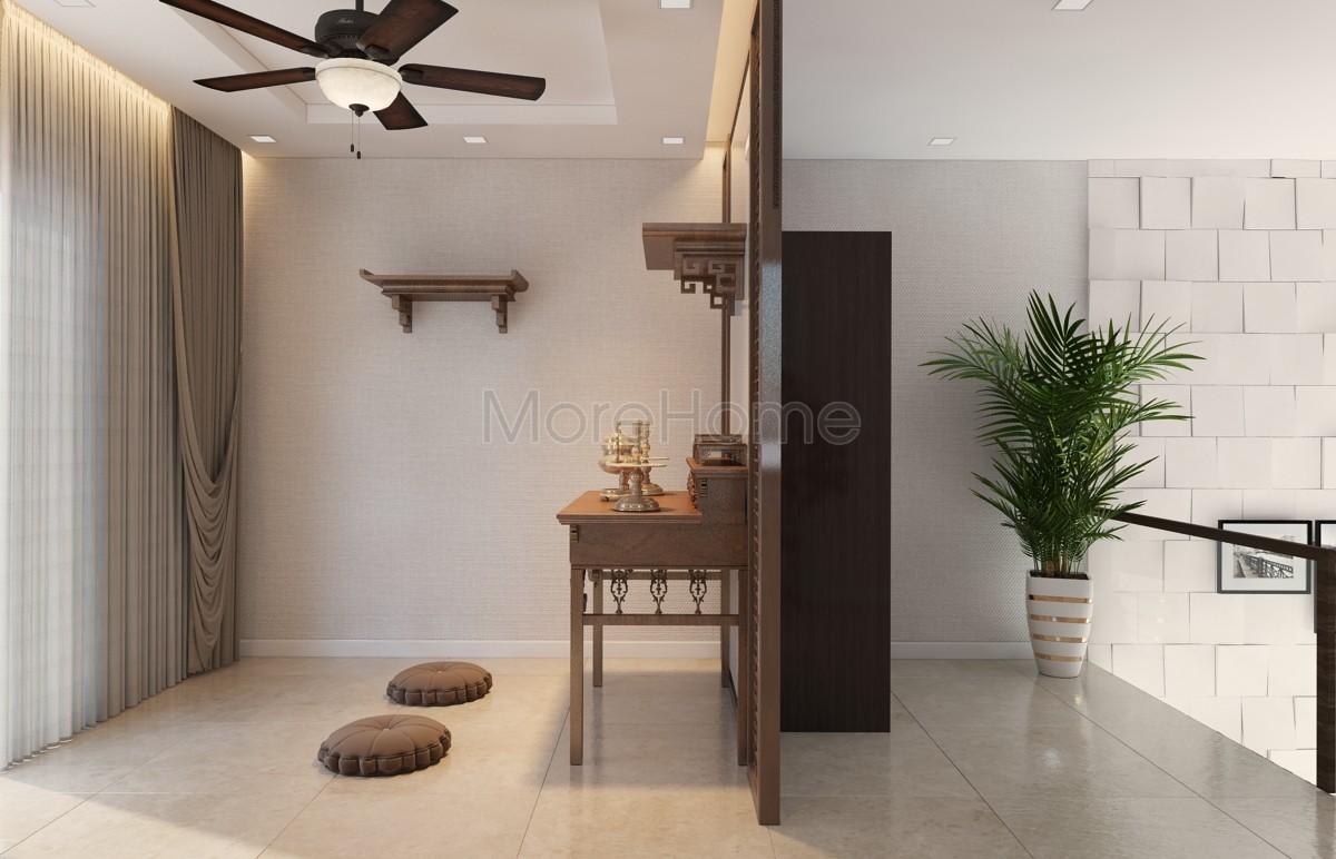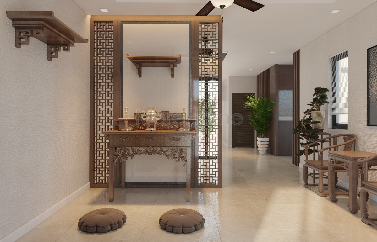 Gia chủ đã lựa chọn không gian thờ cúng riêng biệt nhằm mang đến sự thanh tịnh cho người đã khuất. Phòng thờ được thiết kế với 2 mẫu bàn thờ đó là bàn thờ treo tường và tủ thờ đều được thiết kế với chất liệu gỗ tự nhiên cao cấp. Vách ngăn cnc giúp không gian phòng thờ thêm hoàn mỹ hơn.