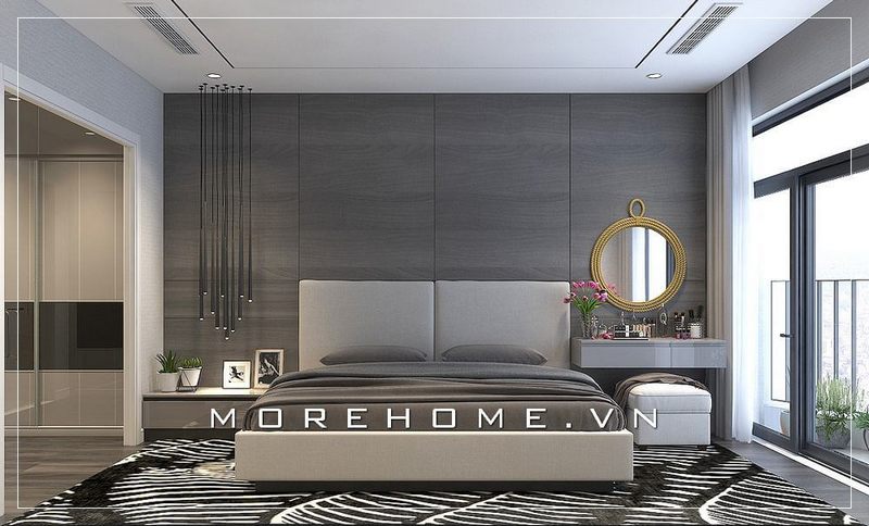 Giường ngủ bọc vải màu xám tinh tế, nhẹ nhàng mà không kém phần ấn tượng