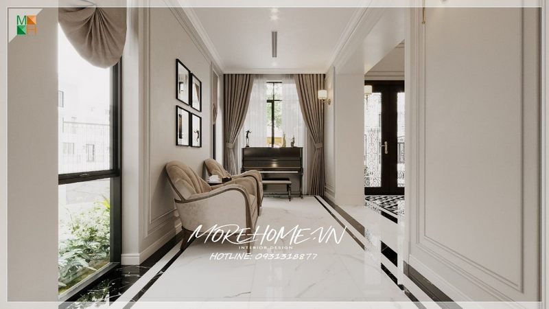 Gia chủ có thể thay đổi không gian tiếp khách trong sảnh hành lang biệt thự bằng cách bố trí một bộ sofa đơn để có thể dành thời gian thư giãn cá nhân.
