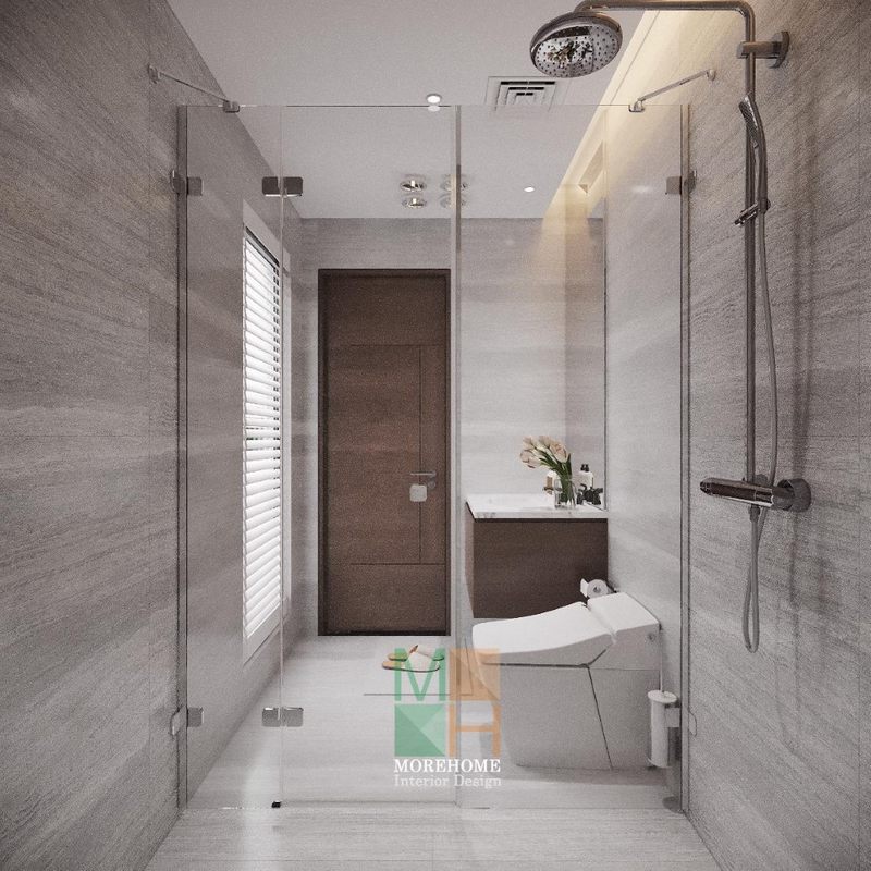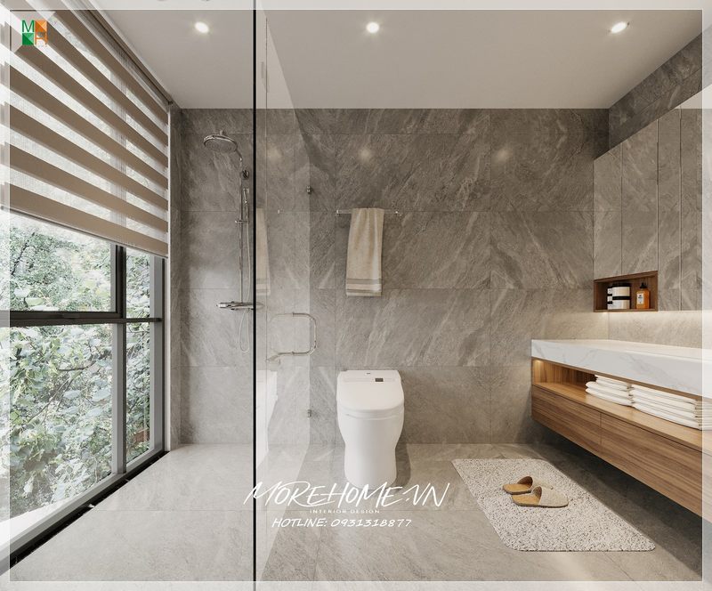 Không gian phòng tắm được biểu lộ sự sang trọng qua đá lát sàn và ốp tường vân mây cao cấp.